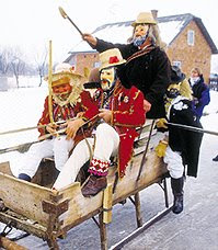 Joyful and lively merrymaking begins with Malanka progressing through the town followed by crowds of people gaily and bizarrely attired . Their disguises grotesquely represent "soldiers," "musicians," "old women," "old men," "witches," "Jews," "medicine men," "Gypsies", and even "Grim Reaper" himself. The slowly moving procession stops once in a while and a sort of folk theatre performance begins, full of humour and improvisations. “Old women” in bright kerchiefs sweep the thresholds of houses, broad-shouldered “angels” greet drivers, and their wings, made from remnants of curtains, wave on tempo. Musicians accompany “devils” and “bears”, and youth in carnival costumes enact Robin Hood round-ups, stopping cars and fining drivers for soberness. The sombre figures of the procession look spooky but can scare only little children.